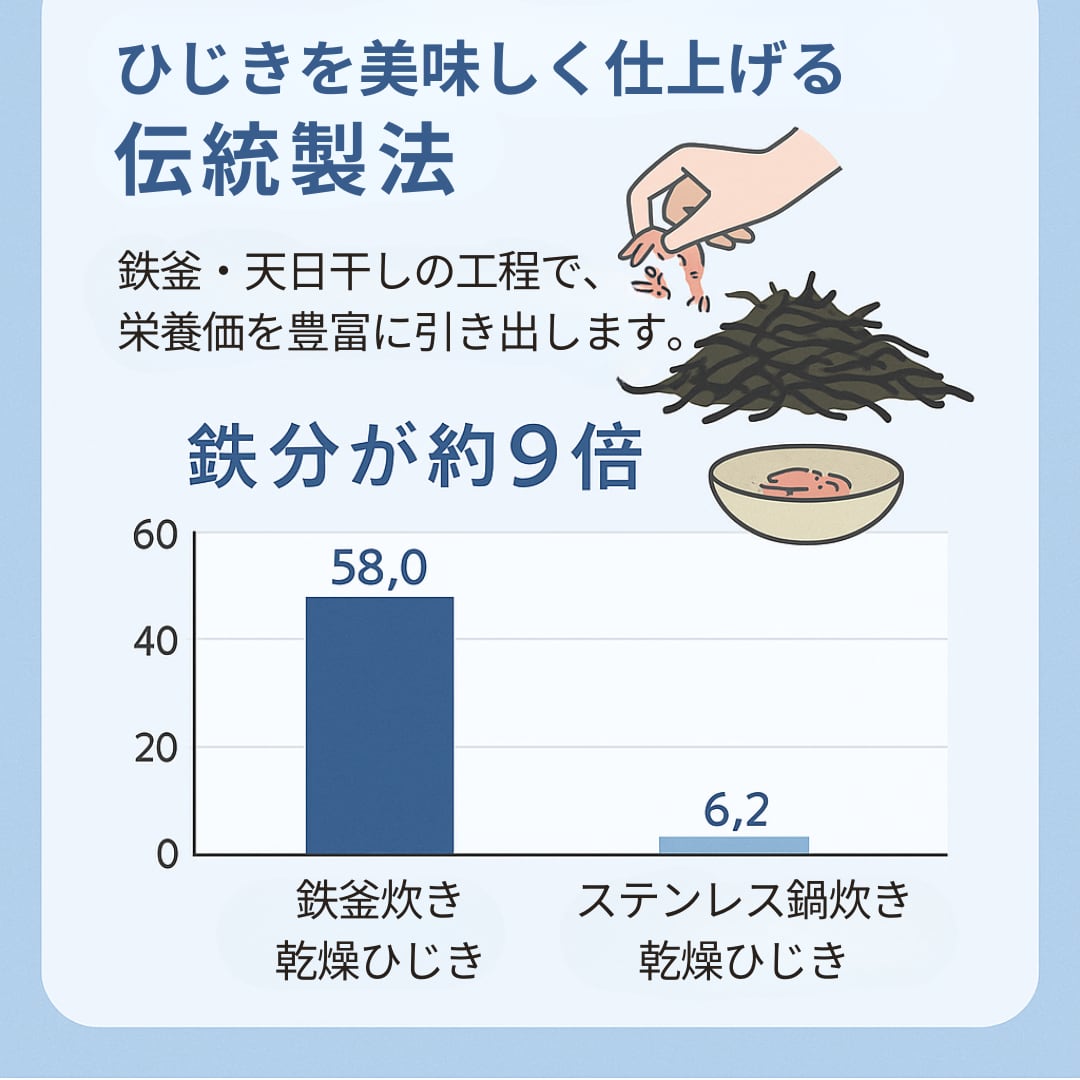 鉄分含有量は、一般的なステンレス釜製品の約9倍(100gあたり58.0mg)。黒々とした艶と滋味深い味わいが特長で、鉄分補給を意識する方や、日々の食卓で美容・健康に配慮したい方にも取り入れやすい自然食材です。